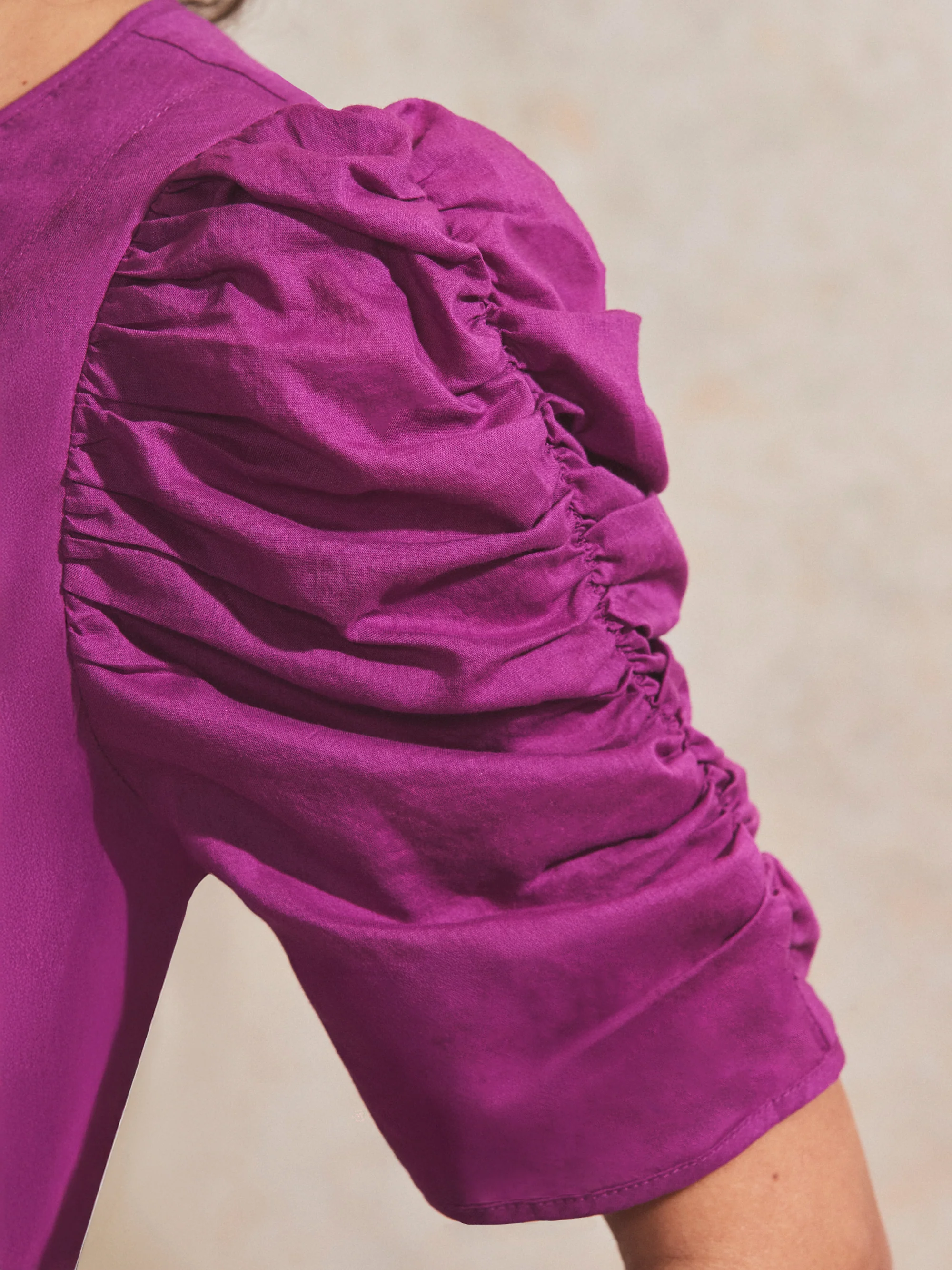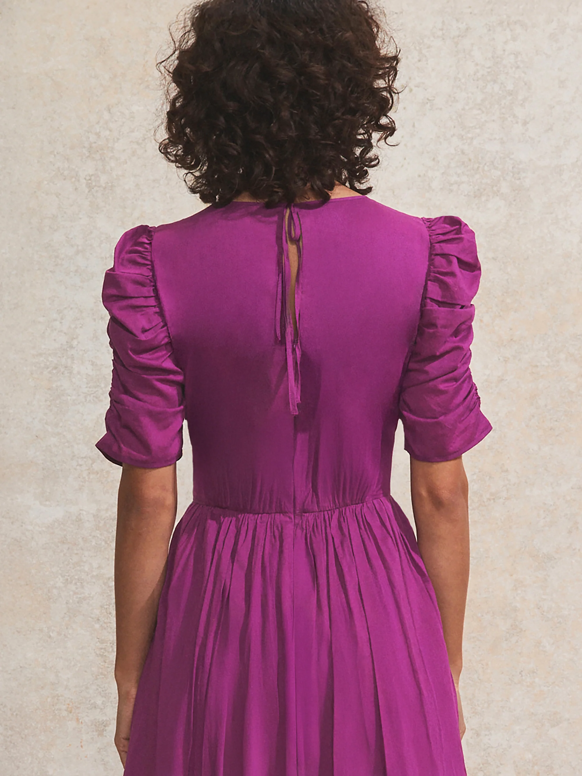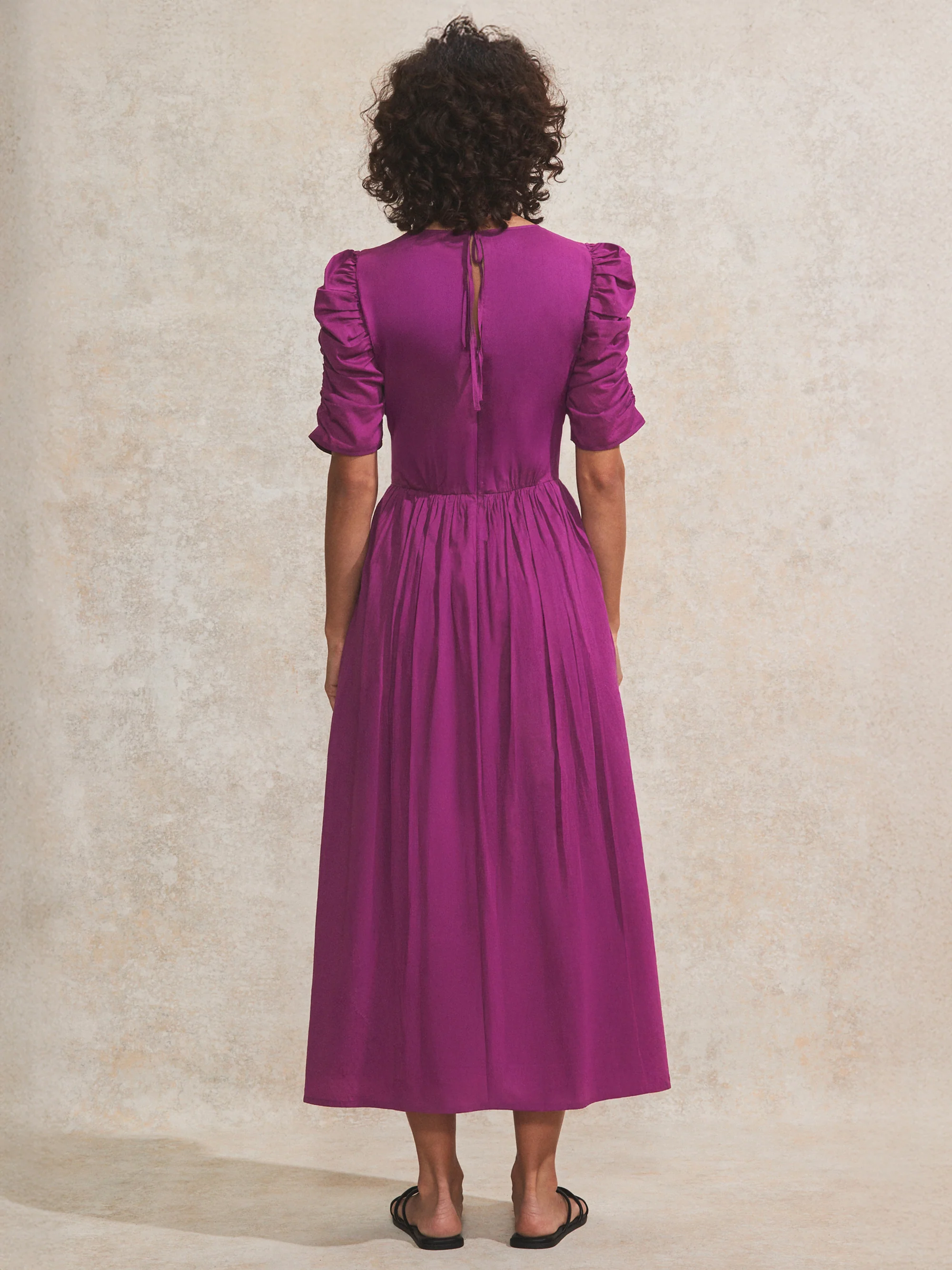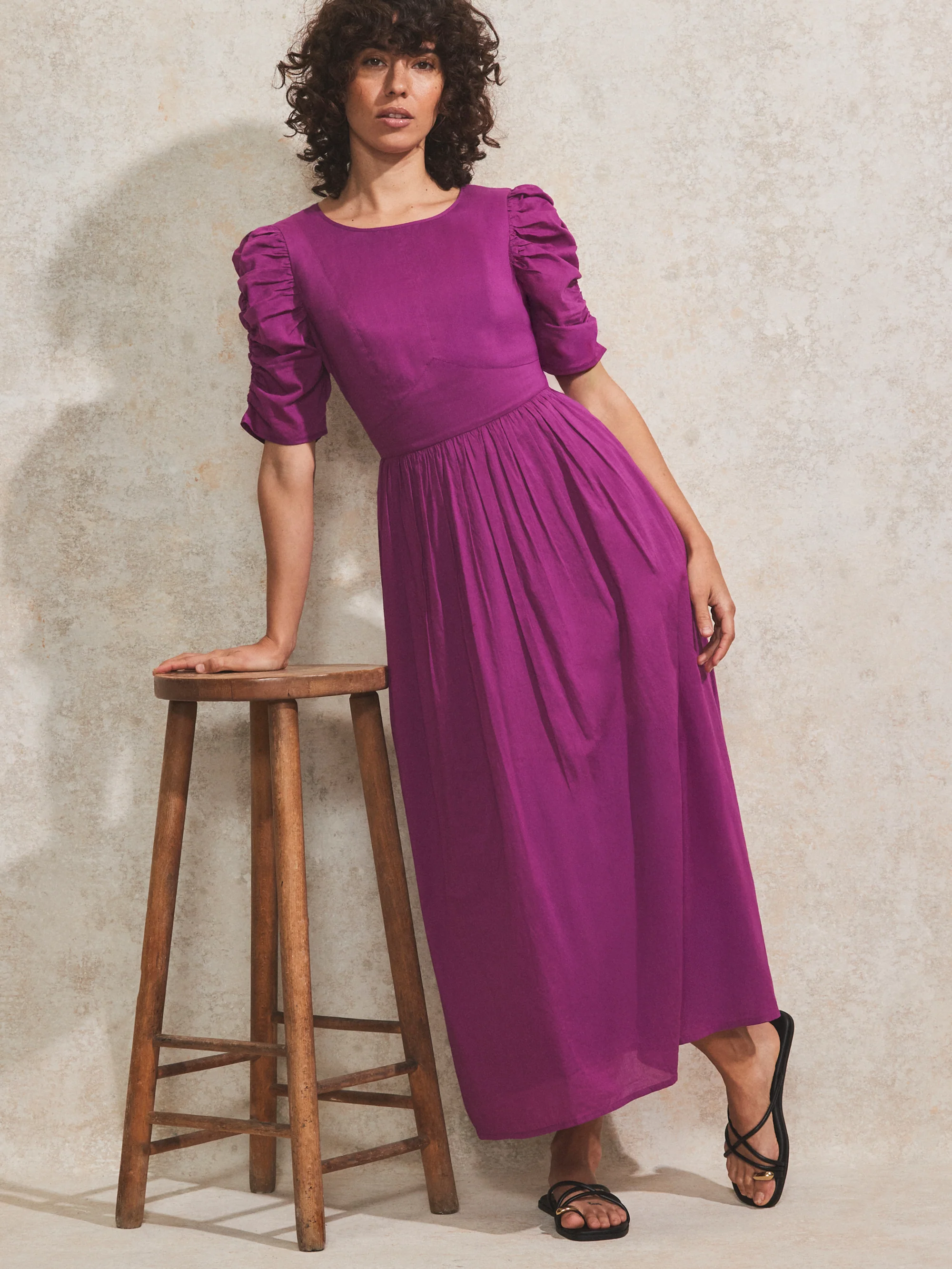 Magenta Gathered-Sleeve Cotton Voile Midi Dress