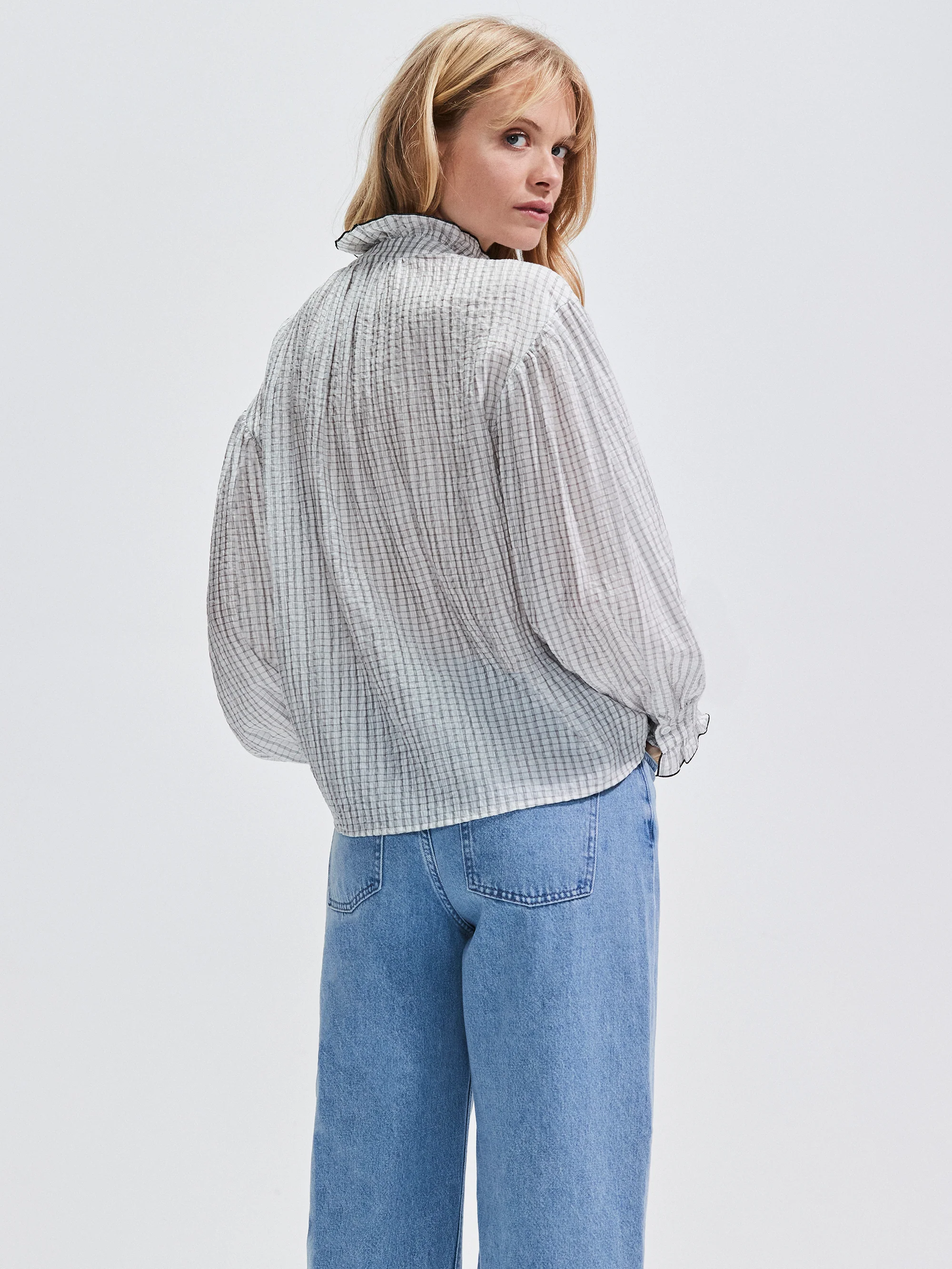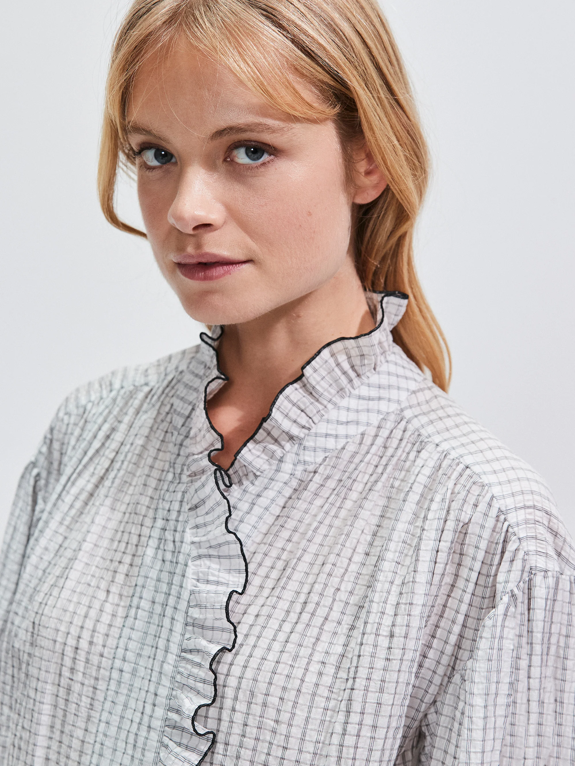 Mono Check Frill-Detail Blouse