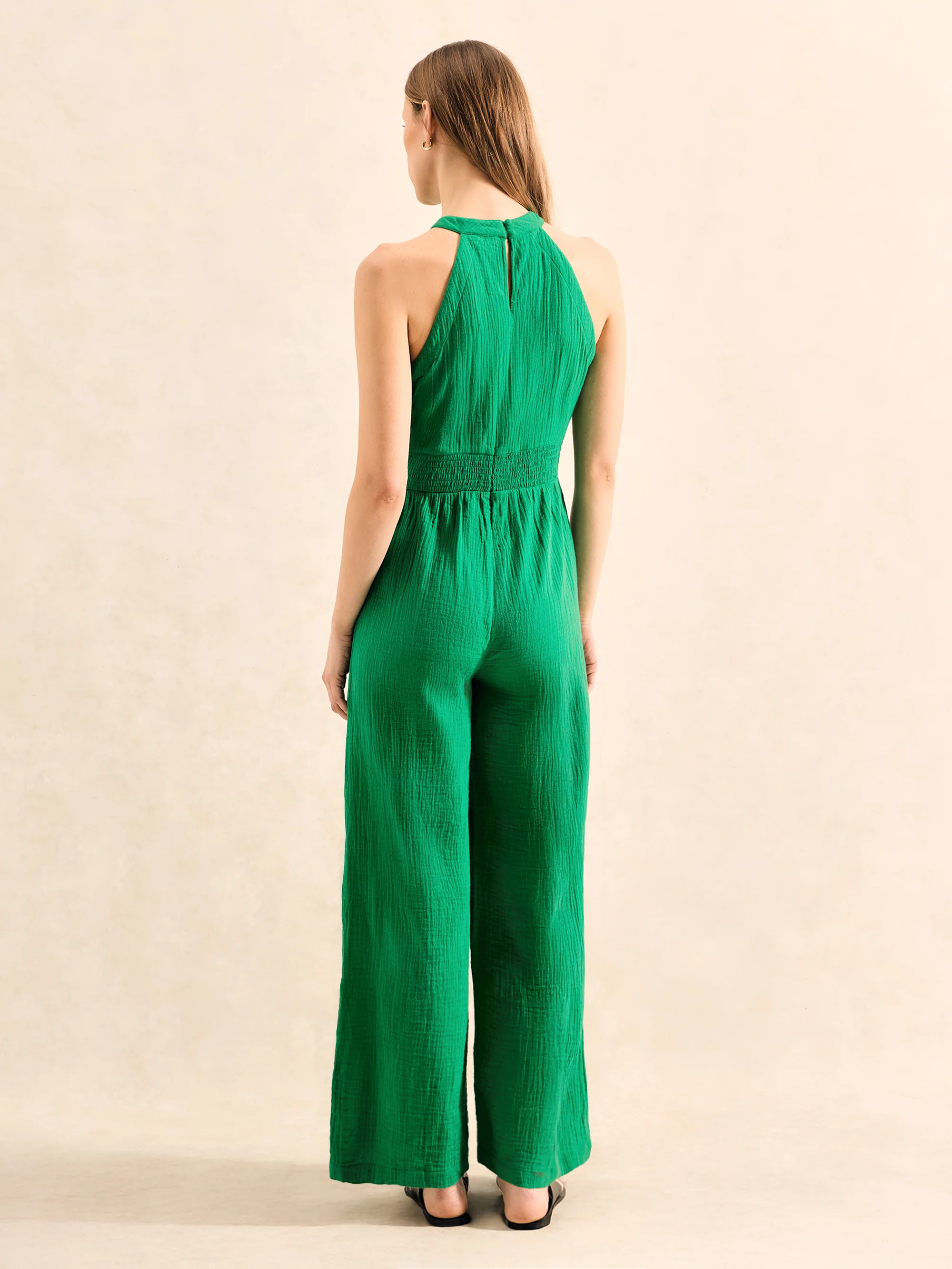 Green Shirred Waist Cheesecloth Jumpsuit